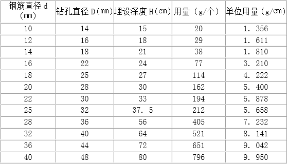 注:固料比重:1.8 g/㎝3,錨固料的計(jì)算用量與實(shí)際用量的誤差在于:打孔直徑與深度的差別。